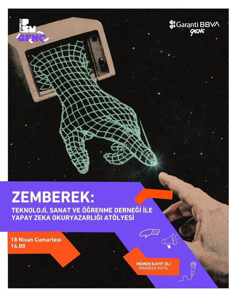 Zorlu PSM'nin genç yetişkinlere yönelik alanı PSM Genç'te, Zemberek yürütücülüğünde Yapay Zeka Okuryazarlığı Atölyesi düzenliyoruz. Teknik detaylara boğulmadan, yapay zekanın sınırlarını ve algoritmaların önyargılarını deneyim odaklı bir akışla birlikte test ediyoruz. Yaratıcı üretim süreçlerinde nasıl kullanılabileceğini keşfederken, bu teknolojinin etik ve toplumsal boyutlarını da tartışıyoruz.