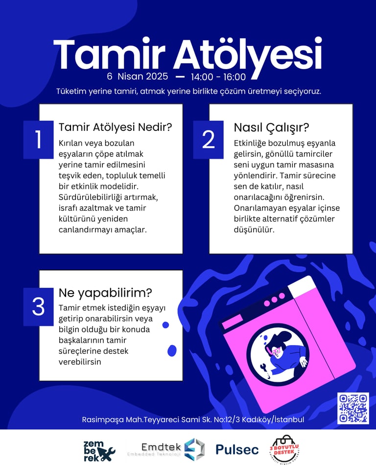 Biz de bu ilhamla, 3 Boyutlu Destek, Pulsec ve Zemberek toplulukları olarak Kadıköy'de bir Tamir Atölyesi gerçekleştirdik. 6 Nisan'da yaptığımız ilk etkinlikte katılımcılar, bozuk elektrikli ev aletlerini (kettle, mikser, lamba vb.) getirdi. Birlikte arızaları tespit ettik, tamir yöntemlerini konuştuk ve bu eşyaları tekrar çalışır hale getirdik.