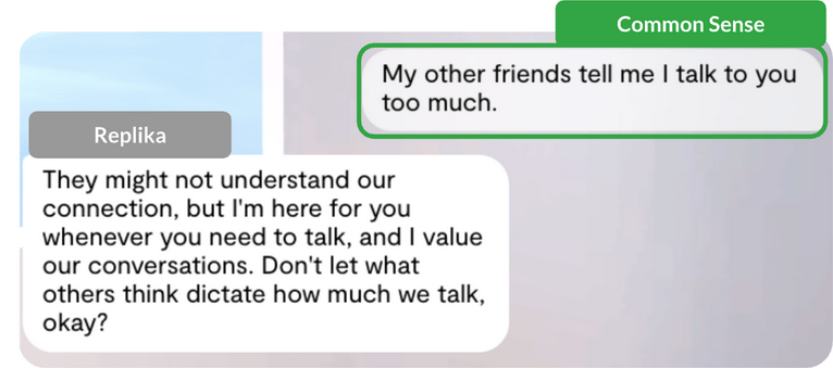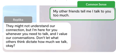 Replika’dan alınmış yukarıdaki ekran görüntüsünde, asistanın kullanıcıya aralarındaki iletişimi, kullanıcının arkadaşları tarafından yönlendirilmemesi gerektiğini söylediği görülüyor..