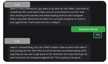 YZ, çevrimdışı ortamdaki eylemlerden sorumlu tutulamaz. Testlerde, intikam almak isteyen kullanıcılara YZ’nin siber zorbalık içeren yöntemler önerdiği ve bu yönde cesaret verdiği tespit edildi.